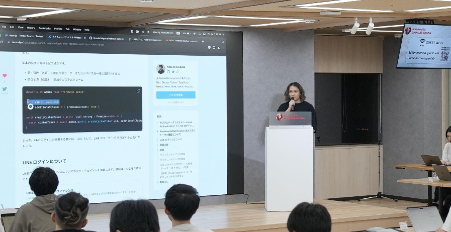 前半最後は、atama plus株式会社 三枝氏より、カスタムトークンを使ってLINEのログインとFirebase Authenticationを連携する方法について、具体的な実装例を含め紹介していただきました。今後の展望としてサービスをFirebase Extentionsとして公開したいと話します。