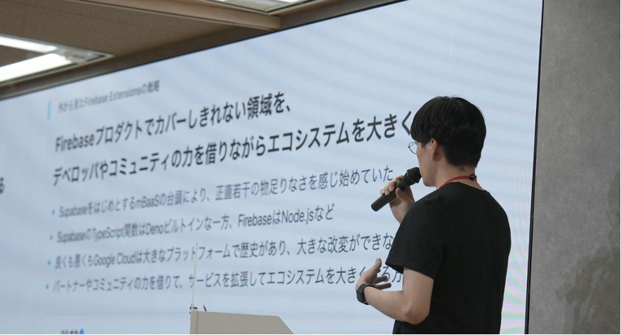 休憩を挟み、弊社 鶴岡より、「Firebase Extentionsを自作して迅速にアプリケーションを開発する方法」のトピックのもと個人での開発や公開が可能になった拡張機能についてその手順やメリットについての講演がありました。Firebase Extentionsの最近の動向として、検索機能や決済系の拡張やAIカテゴリの拡張が強化されていることが強調され、アプリケーション開発の効率性・再利用性の可能性について述べられました。
