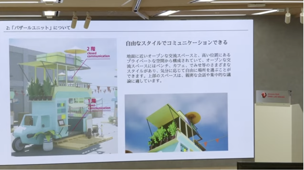 小さな屋台のようなバザールユニットが都市に集合したコミュニケーション空間をプロデュース。ワクワクするものに囲まれ、ユーザー自身が好きなユニットと交流の仕方を選び、自分と気の合う人とつながることができます。また、ユーザー自身によるカスタマイズだけでなく、企業やクリエイターとのコラボレーションも可能とし、メタバース空間内の流動的なメディア空間として機能させることができるといいます。
