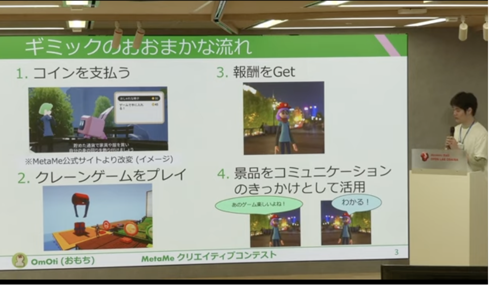 この作品に対し、株式会社Indie-us Gamesの坂井氏からは「MetaMeの現在のコンセプト、特に個人のアイデンティティとコミュニティの両面を重要視するアプローチにおいてこのアイデアは非常に適合しており、MetaMeのコンセプトとの調和が高い」と講評がありました。加えて、一つのコミュニティを作っていくという発展性やカスタマイズ性のよさも高く評価されました。
