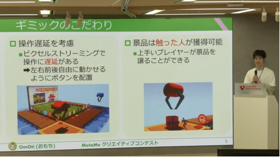 MetaMeにすでに実装されている、コインで買い物ができるシステムを発展させ、「みんなで」「楽しく」アイテムを入手するために複数人でのプレイに対応したクレーンゲームです。どちらが先にアイテムをゲットできるか競ったり、グループで協力したり、さまざまな楽しみ方ができそうです。