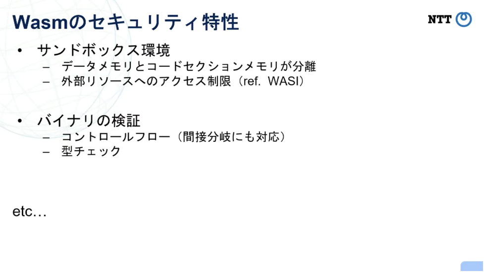 続いて、NTTソフトウェアイノベーションセンタの吉村氏より「様々なWasmのセキュリティ」についての講演に移ります。Wasmのセキュリティの特性について触れられたのち、WasmConでの2つのセッションの紹介がありました。1つ目のセッションでは、Wasmの安全性について解説がありました。Wasmのセキュリティの特徴として挙げられるデータメモリとコードセクションメモリの分離により、スタックを攻撃されたとしてもアドレスのチェック等でエラーが起こる仕組みであるため、canaryが不要である点が述べられました。ただし、ランタイムに脆弱性があったり、悪意のあるWasmのモジュールを実行することは危険であるため、セキュリティ層を追加することはやはり軽視してはいけないプロセスだといいます。2つ目のセッションは、「Wasmtimeでのセキュリティ確保のための技術」についての講演を紹介していただきました。Wasmtimeでは依存するRustライブラリの検証も行われているといいます。Wasmは一定の安全性しか担保しないため、他の技術との併用やランタイムのセキュリティにも気を配る必要があると強調しました。
