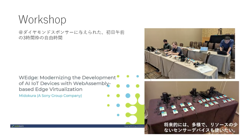 最後のセッション「個人としてミドクラの発表を振り返る」では、実際にWasmConでプロジェクトの発表を行ったミドクラジャパン株式会社の清水氏により講演がありました。WasmCon 2023で発表されたプロジェクト「WEdge Project」は、デバイス・OSの縛りを排除し、開発者がアプリケーションを書くハードルを下げることをゴールとしていることが述べられました。特定のデバイス向けにソリューション転換する際のプログラムのポータビリティの欠如などを課題として取り組んでいるといいます。WasmCon 2023では、ハンズオンを組み込んだ3時間に及ぶワークショップののちも参加者同士の議論が見られ、盛り上がりをみせました。